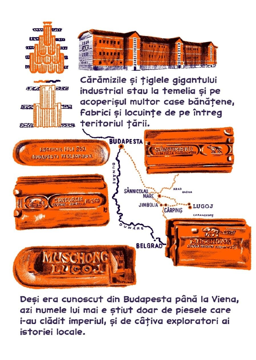 Țigla folosită pentru acoperiș și restul elementeor, se producea în Banat la una din cele câteva fabrici ale lui Iacob Muschong. Marele industriaș a construit câteva fabrici în Banat, dar și în Budapesta. „Cărămida și țigla produse de Muschong erau de mare calitate și erau vândute în tot Imperiul Austro-Ungar, iar mai apoi și în România.”