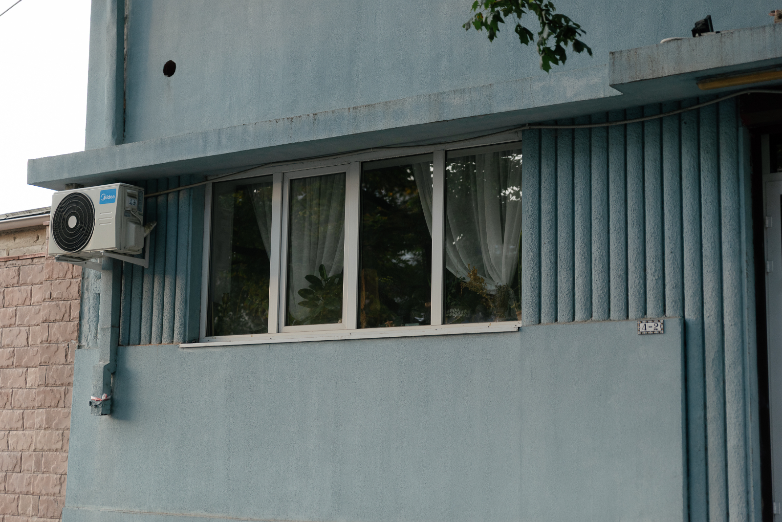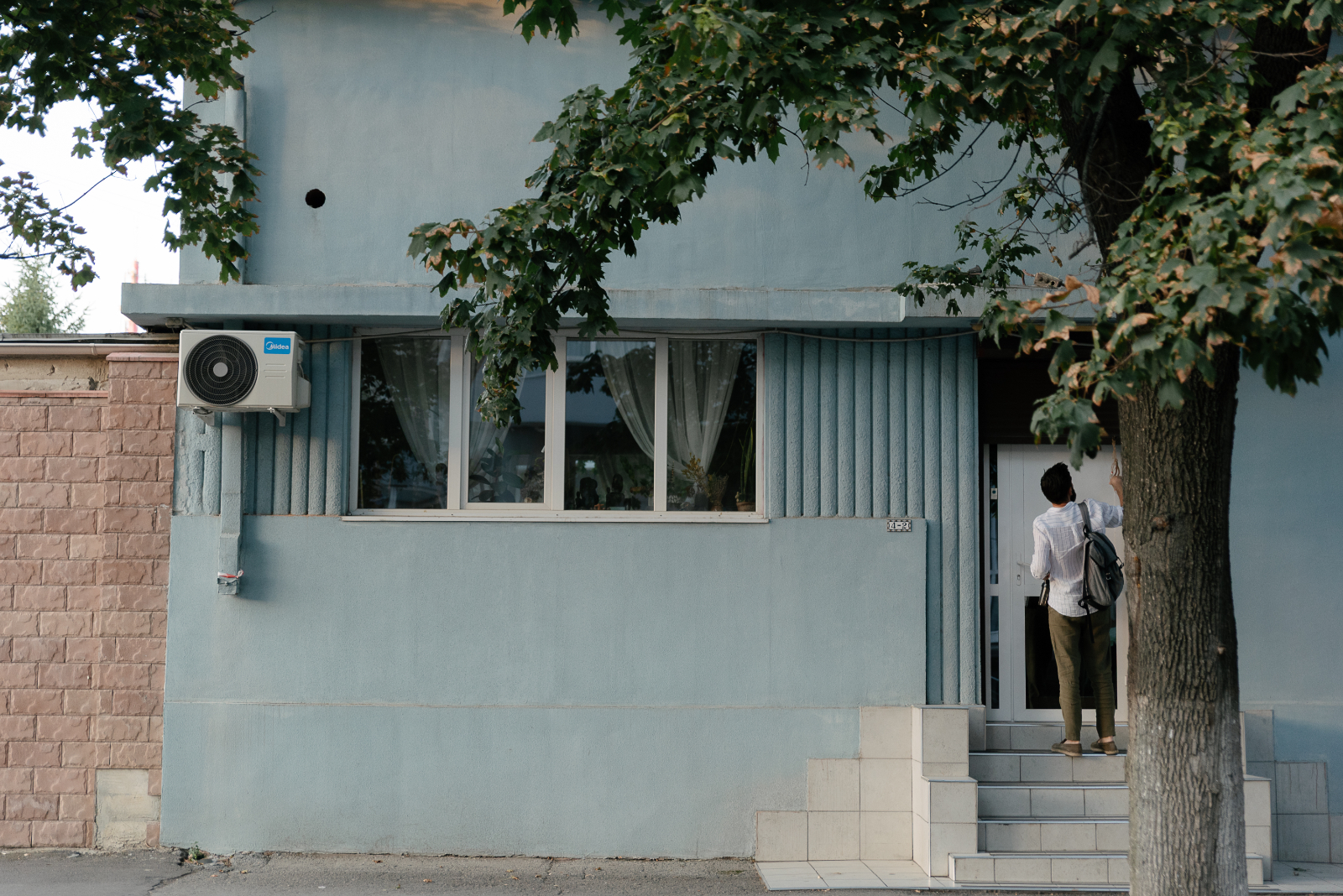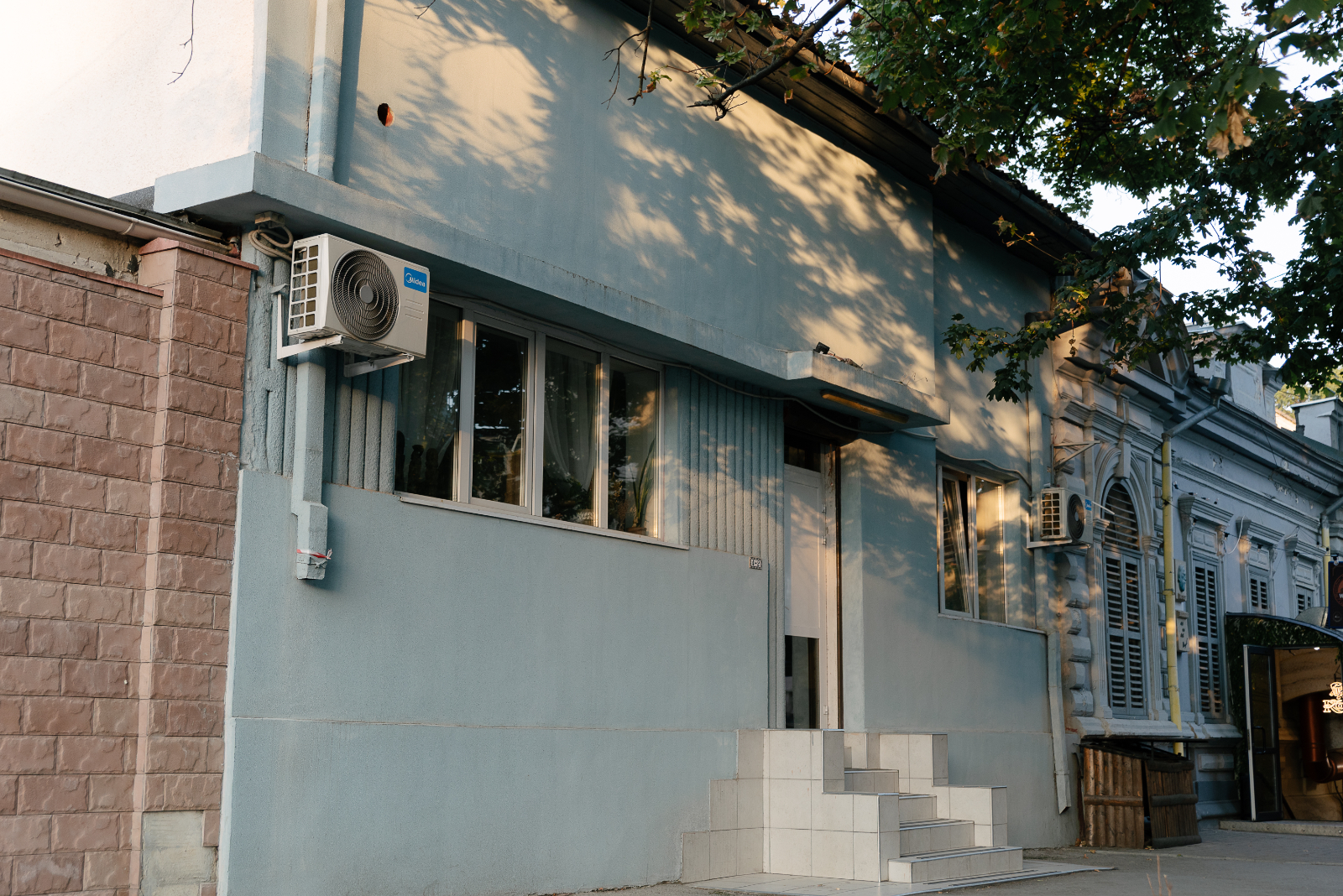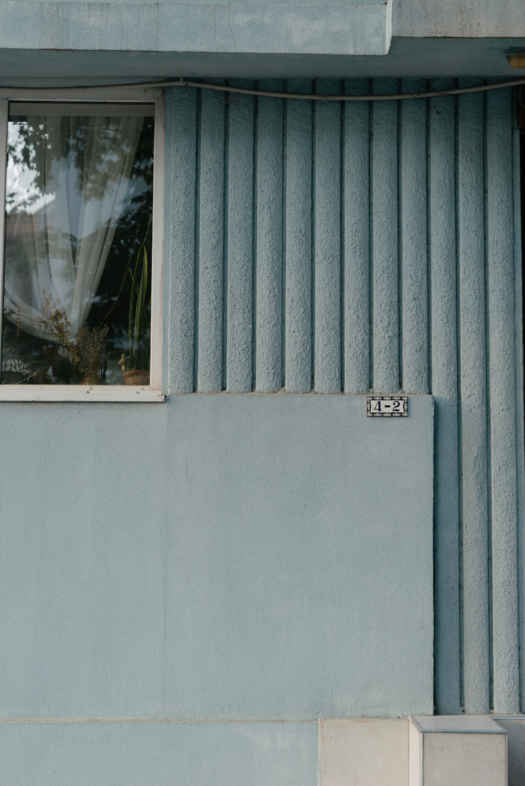 Uşa este protejată de o copertină din beton continuată deasupra ferestrei apropiate până la colţul clădirii şi pe faţada laterală. Din ambele părţi ale acestei ferestre pot fi văzute striaţii verticale adâncite, mai scurte lângă fereastră şi mai lungi lângă uşa de intrare. Asemenea detalii, sunt specifice arhitecturii moderniste.